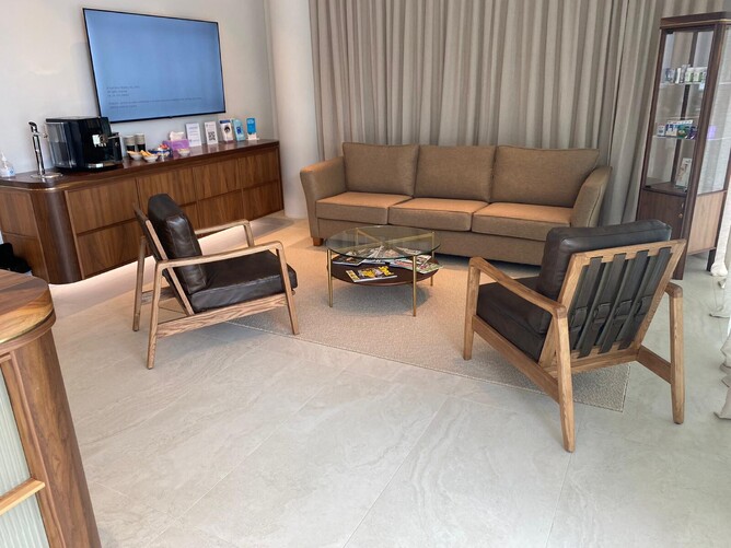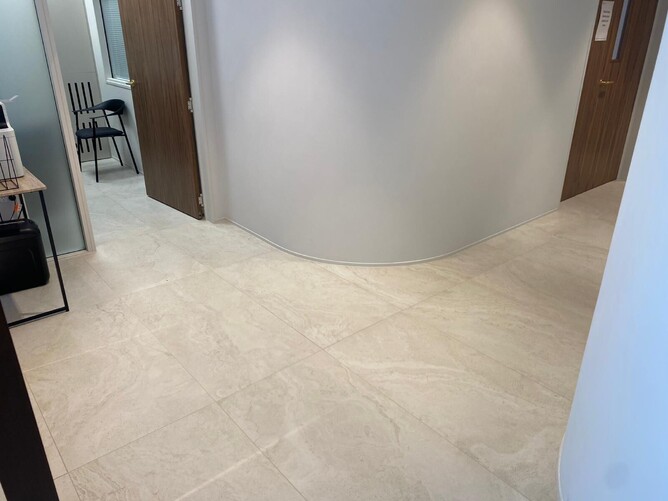 The clinic features large slab tiles in soft neutral hues. A curved feature wall has perfectly cut curved tile along the floor-line.