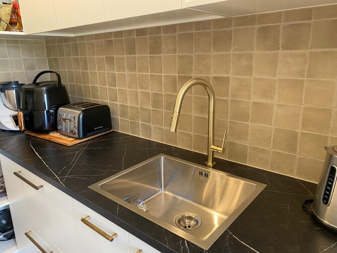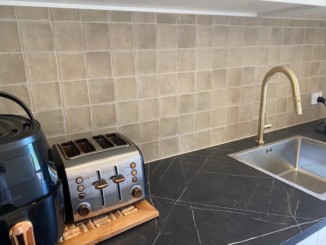 Our extensive tiling work includes fully tiled bathrooms and powder room, a beautiful tiled kitchen backsplash and tiled scullery backsplash, and a natural stone fireplace. For extra comfort on those cold winter days, Warmup underfloor heating has been fitted.