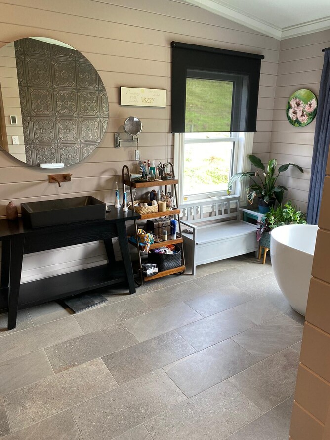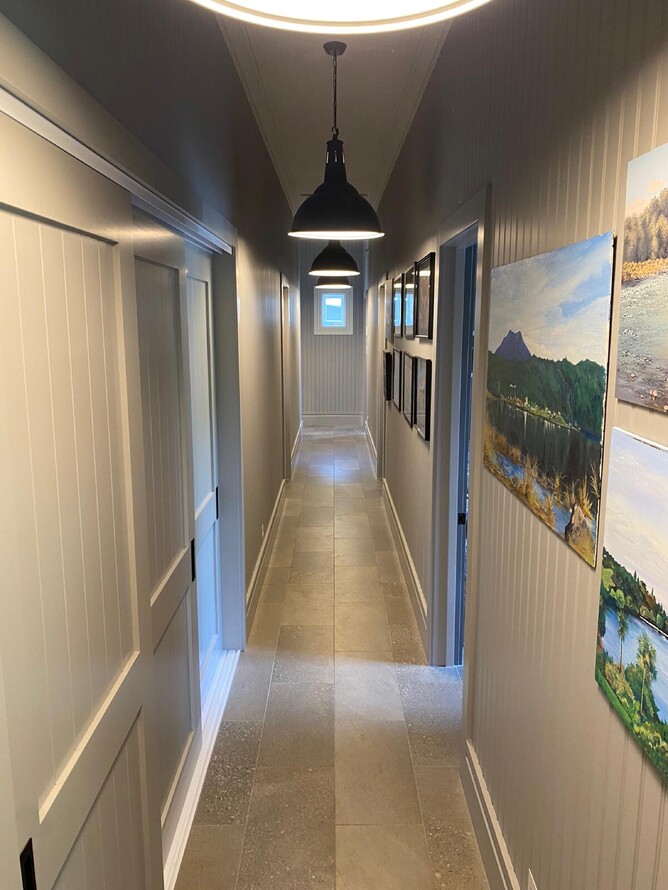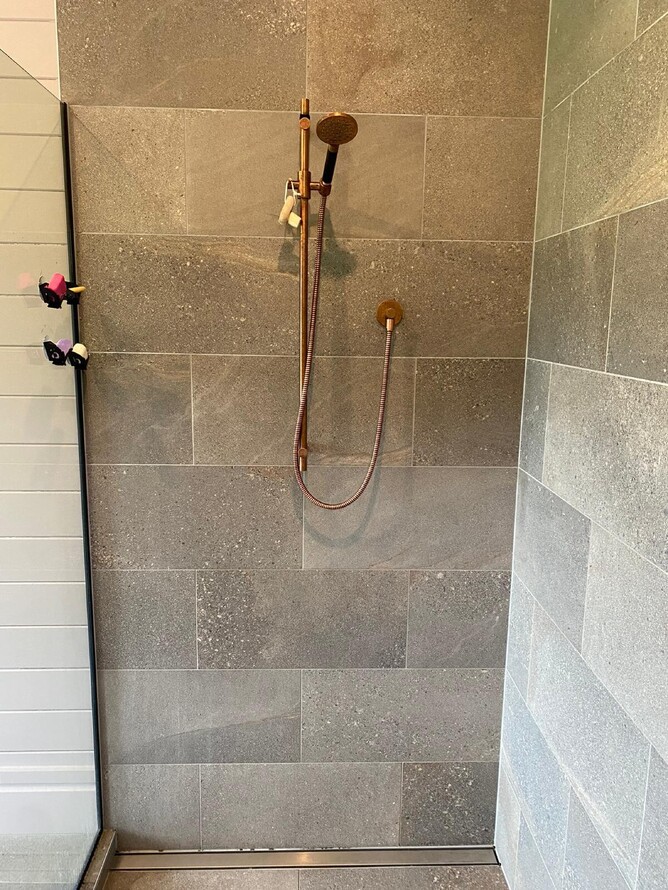 Here we're sharing a beautiful fit out for Wayne Stewart Builders. The same seamless flooring tile extends through the hallways, bathrooms and office spaces. Accent wall tile in the bathroom makes a statement, while frameless glass showers give a sense of elegance.
