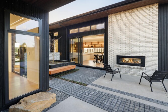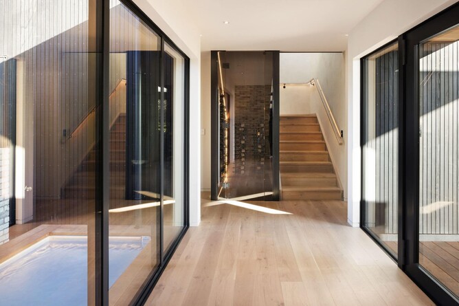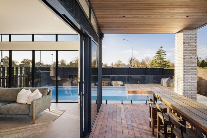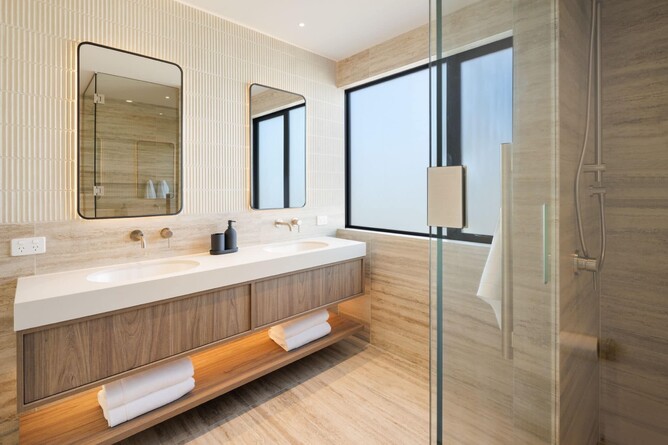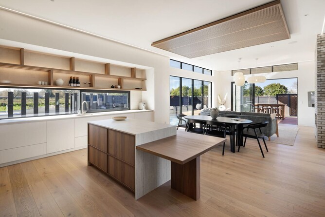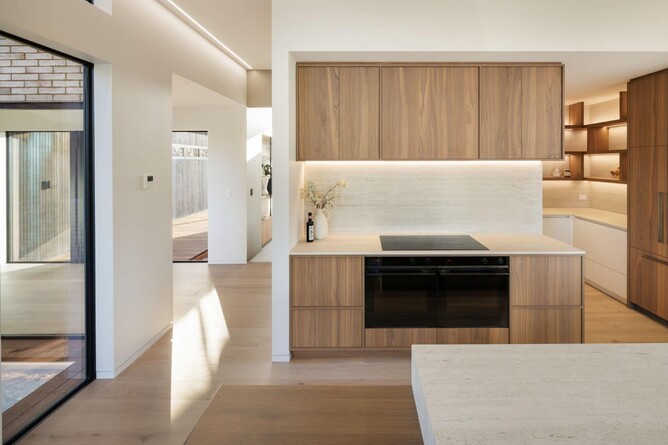 The neutral colour palette is carried throughout the house, with textured tile features creating interest and warmth in the bathrooms and kitchen. A fully shelved and tiled butlers pantry has been designed for practicality, while a statement backsplash and tiled open timber shelving in the kitchen create some wow factor in the main living space.