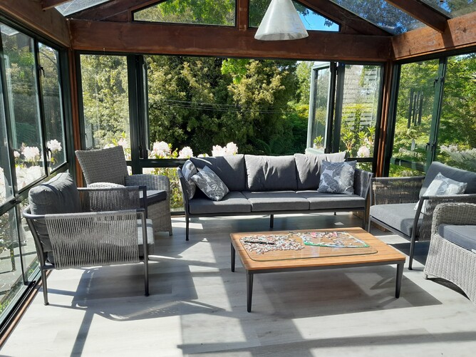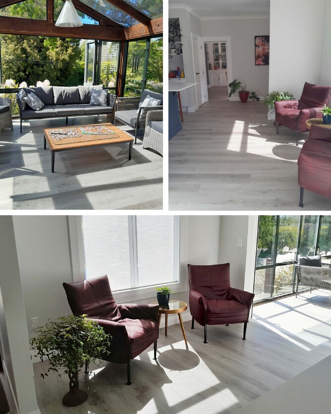 They selected environmentally friendly composite flooring that is mildew and moisture proof, resistant to fire, and easy to install. An adjoining sunroom has the same flooring carried through, setting off the amazing greenery in the surrounding garden, while brightening the indoor space which used to feel dark with the overhead beams.