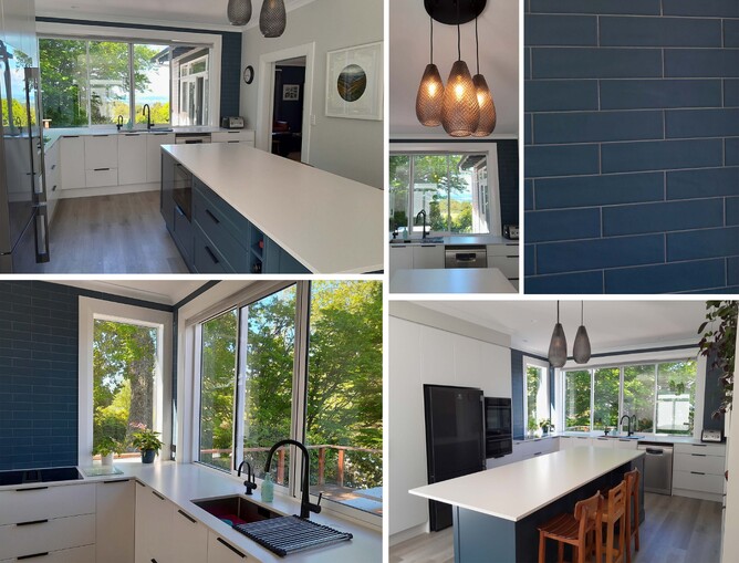 Opting for a blue (Dulux Lake Maungamahoe) kitchen island, the space is balanced with a blue brickset tile splashback. Keeping it modern, the rest of the kitchen has white cabinetry with an engineered silestone benchtop to bring it all together.