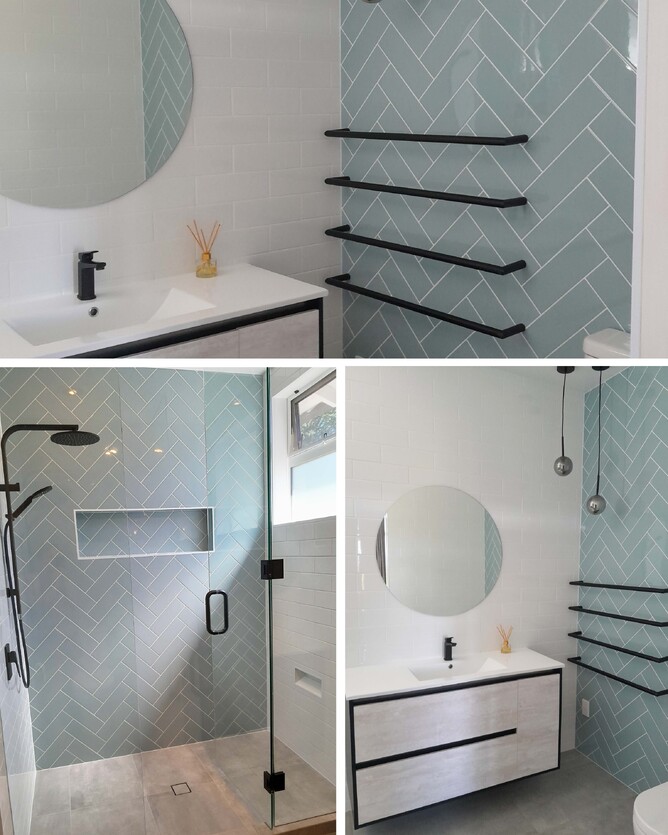 The ensuite features a beautiful walk-in shower, with herringbone blue tile throughout. Tile is carried through the rest of the space as well, with a modern vanity and black towel rail and mirror accessories bringing it together. Feature lighting in the corner finishes off the space.