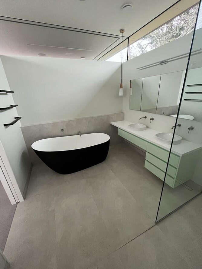 The oversized seamless slab tile look is in, with lots of concrete look tile accented with pastels or timber to make it look sleek and expansive. Check out this bathroom we did for Karl Kampenhout Builders recently.